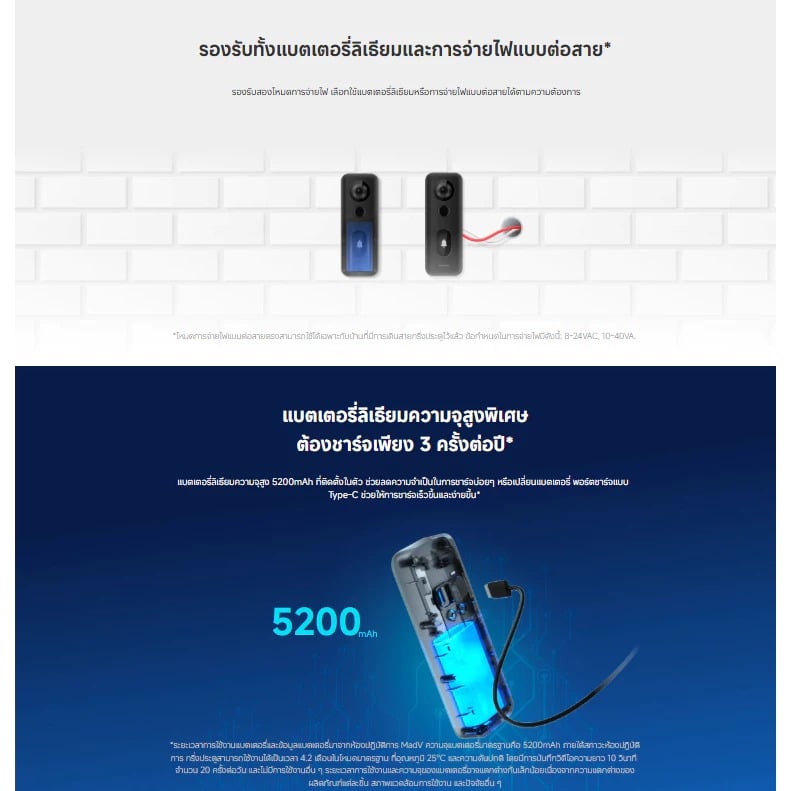 5V⎓2A (พอร์ต Type-C); 8-24VAC, 10-40VA, 50–60Hz (หม้อแปลงกริ่งประตูแบบ AC)